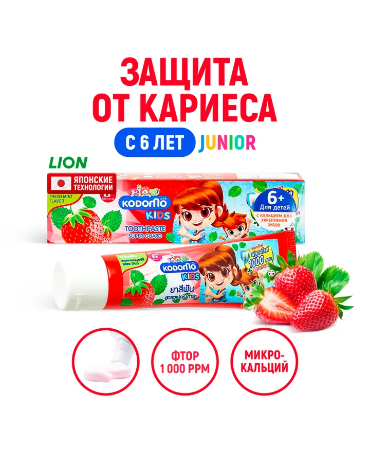 Зубная паста LION с фтором Клубника 65 гОтличная паста с хорошим содержанием фтора за приятную цену , пользуемся я и мой двухлетний сын . Хорошо очищает налет.