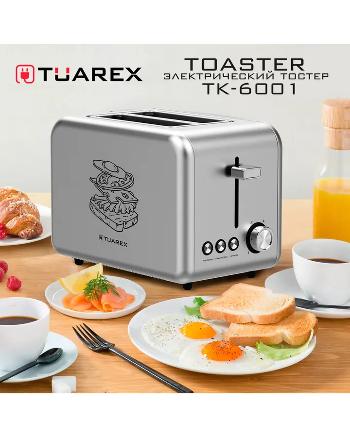 5Тостер электрический TUAREX tk-6001Спасибо, товар только вчера получила, сегодня утром тостер был опробован и сейчас я спешу поделиться теми первыми впечатлениями, какие у меня уже сформировались от покупки в целом. Для начала спасибо за быструю доставку! Товар в отличном состоянии! Корпус тостера металлический, что делает его внешний вид более солидным, немного строгим, но мне такое очень по душе. Панель управления состоит из трёх кнопок с красной подсветкой-индикатором и регулятора с шестью позициями. В общем-то, всё как у всех тостеров, или почти как у всех, так как некоторые модели не имеют функций подогрева или разморозки, когда как у данного тостера они есть. Но для меня не столь важны эти дополнительные функции, сколько мощность!