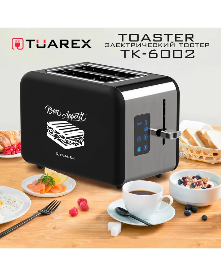5Тостер электрический TUAREX TK-6002Выглядит круто, работает мощно, и на удивление недорого стоит для тостера с сенсорным управлением. Честно скажу, я впервые такой покупаю, до него был простой и дешёвый, с кнопками, пластиковый, весь пожелтевший от старости, вот и захотела поменять на новый, красивый. Не ожидала, что сейчас уже продаются такие тостеры с сенсорным управлением, меня это неслабо впечатлило. Точно так же неслабо впечатлила и мощность тостера, быстро поджаривает. Ручка, которой хлеб погружается внутрь тостера, может приподнять хлеб, чтобы его легче было вытащить, это пригодится на случай, если загрузить в отсеки маленькие ломтики, которые еле-еле торчат из отсеков. Запаха нет! Только аппетитный аромат поджаренных тостов.