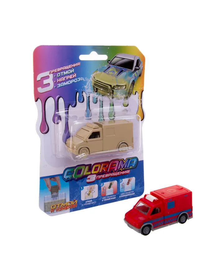 Автомобиль COLORAMA МЧС модель 2Отлично! Достаточно контрастно меняет цвет с красного на желтый. Сперва расстроились что краска смылась под водой, а это то ли защита какая-то, то ли прикол. В реале машинка красная. Теперь хотим еще из этой серии. Рекомендую!