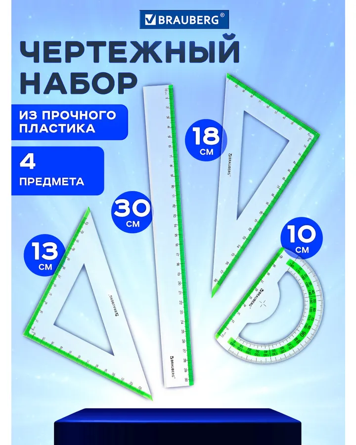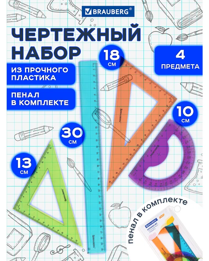 5Набор чертёжный Brauberg пластик 4 шт.Хороший наборчик. Пенал удобен, чтоб не валялось все в портфеле