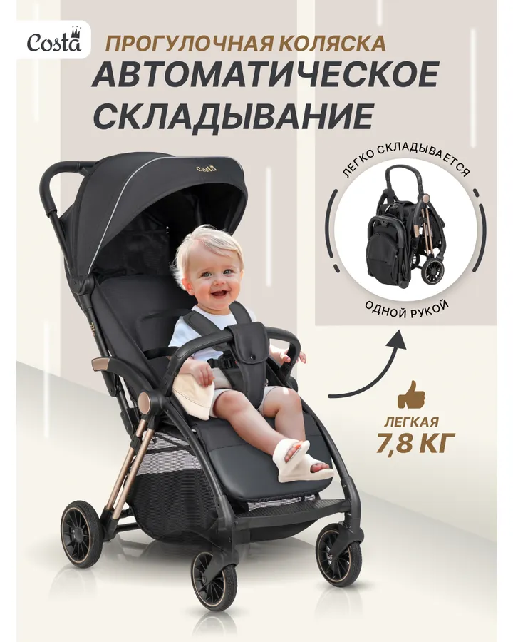 5Коляска прогулочная Costa с автоматическим складыванием бежевыйИскала лёгкую коляску на лето. Долго выбирала. Устала выбирать, тк по отзывам у всех что-то ломалось)) Поэтому взяла ту, которая подошла по моим запросам и мало отзывов в интернете)))Коляска понравилась. Абсолютно летний вариант, несмотря на наличие накидки на ножки. Цвет ближе к светло-серому, ткань красивая, с рисунком, еле заметным. Складывается-раскладывантся легко. Одной рукой не пробовала(не было необходимости), но, думаю, приловчиться можно. Проходимость для легкой коляски неплохая. На неровной дороге трясёт, но в пределах реальности))) Немного гремит пластик в ставках по бокам на неровностях(на это обратила внимание в первый тестовый заезд, после не обращала на это внимание). Удобна в управлении для меня, на бордюр заезжает, съезжает легко, приподнять передние колеса, чтобы куда-то заехать, так же легко. При первом раскладывании оказалась горка на сидении(Сидушка из-за конструкции сложения состоит из двух частей), но ребенок 9, 5 кг легко выравнивает все)))