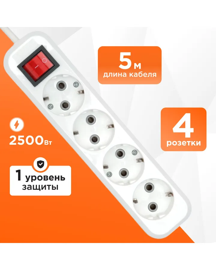 5Сетевой фильтр удлинитель Гарнизон белый 10А 2 метра с выключателем и заземлением 1 уровень защитыСупер