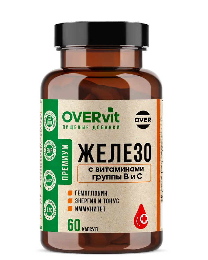 Железо с витаминами группы В и С OVER БАД для повышения гемоглобина, иммунитета, 60 капсул