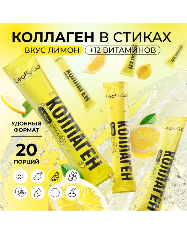 Пептидный коллаген порошок в стиках LeafToGo с Витамином C 20 порций-саше