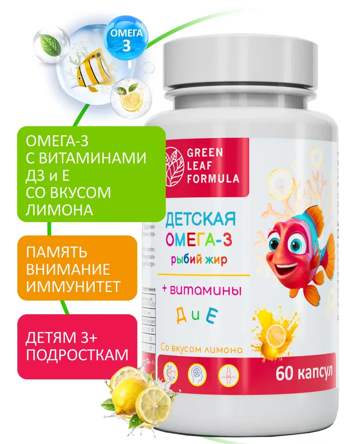 Омега 3 витамины для детей Green Leaf Formula рыбий жир с витаминами Д3 и Е со вкусом лимона детский витаминный комплекс