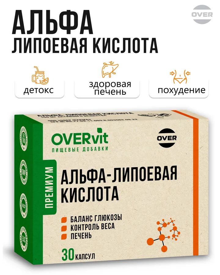 Альфа липоевая кислота OVER БАД для снижения уровня сахара и контроля веса 30 капсул