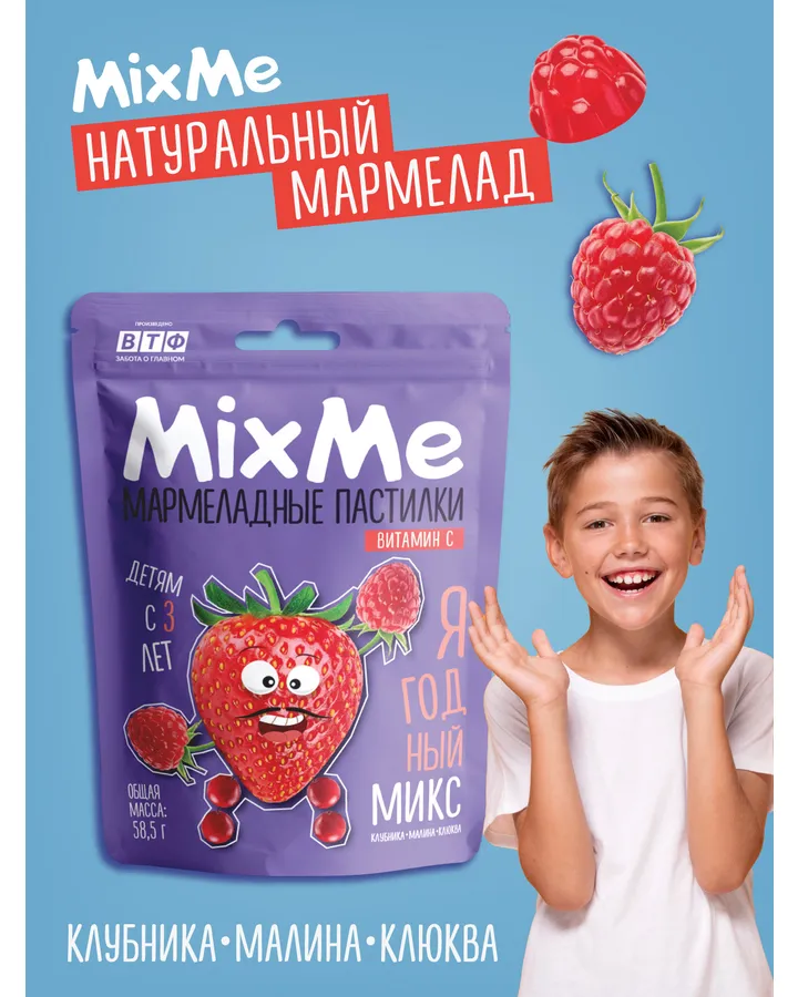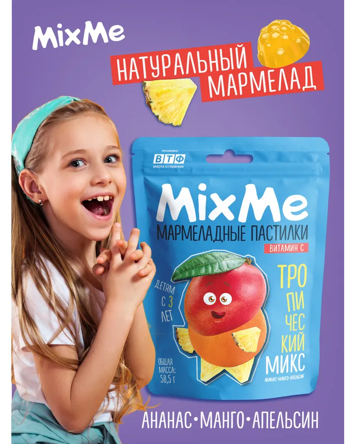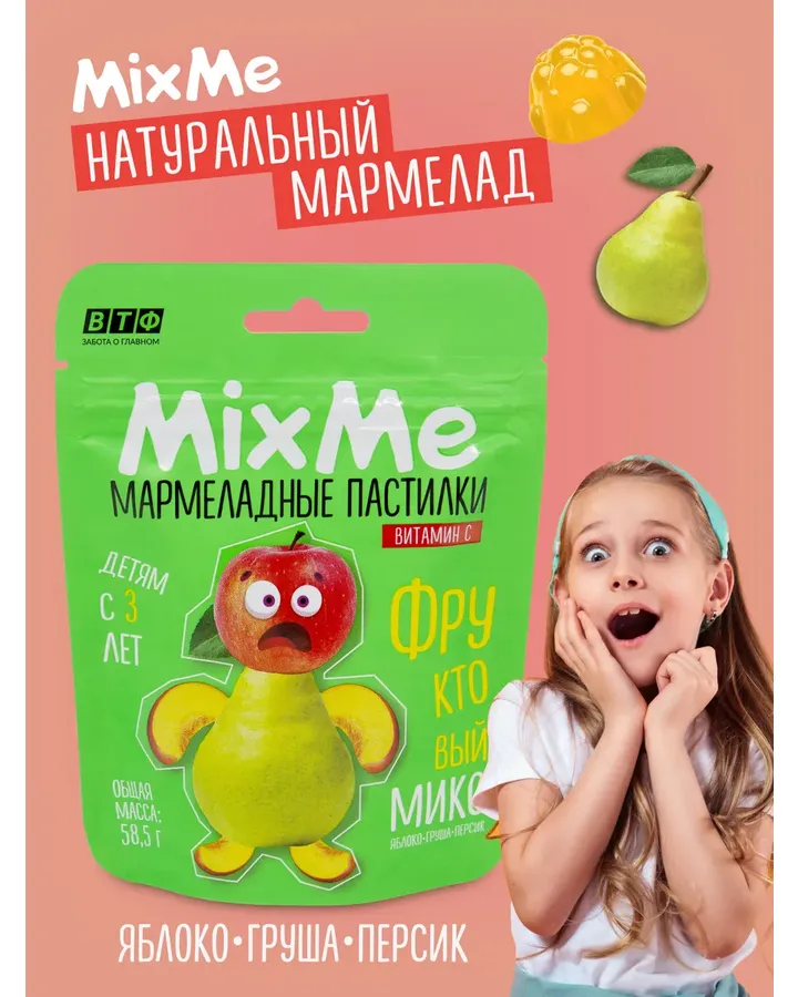 MixMe Витамин С мармелад фруктовый микс (яблоко, персик, груша) 58,5гр в Zip-пакетеЯ, как мама двух погодок, которые вечно крутят носом перед витаминами, я в восторге от этого мармелада! Дети думают, что это конфеты, а я радуюсь, что они получают свою порцию витаминов.Детям нравиться больше чем аскорбинки в крутке,а в мармеладе витамина С больше и вкуснее.