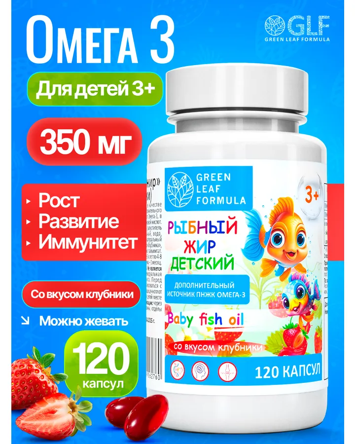 Омега 3 рыбный жир Green Leaf Formula витамины для детей от 3 лет со вкусом клубники 120 капсул