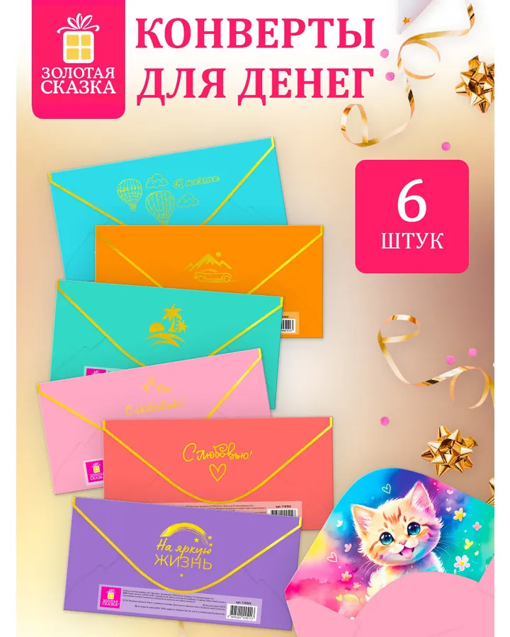 5Конверт для денег Золотая сказка открытка на день рождения и свадьбу в подарок 6 штукПрекрасные конверты! Дизайн на высоте.