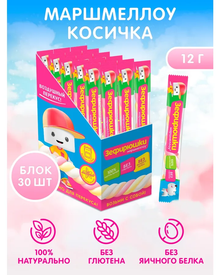 Воздушный зефир Сладкая сказка косичка 7 г х 35 штУпаковка не повреждена. Срок годности хороший. Пришли мягкие. Очень удобно покупать на угощения в школу.