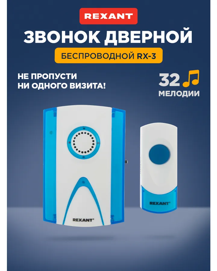 Беспроводной дверной звонок REXANT RX-3 32 мелодии 100м кнопка IP44