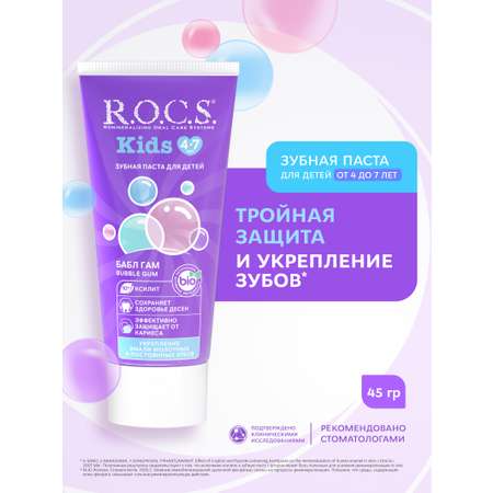 Эффективная зубная паста R.O.C.S. Kids "Бабл гам" со вкусом жевательной резинки для детей от 4 до 7 лет разработана при участии стоматологов с учётом возрастных особенностей ребёнка.