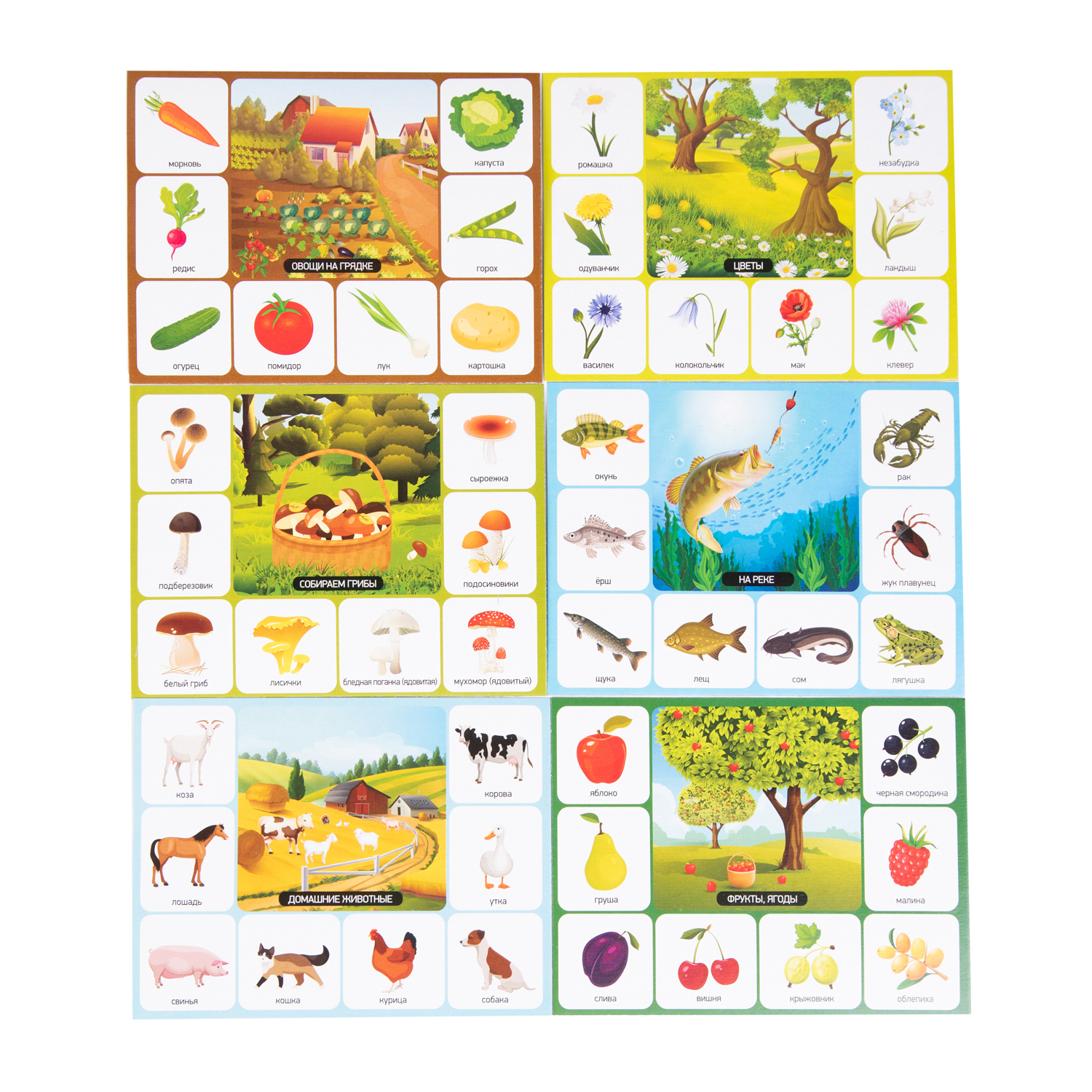 - Карточки затрагивают 6 тем: «Ловим рыбу», «Собираем грибы», «Овощи на грядке», «Домашние животные», «Полевые цветы», «Фрукты-ягоды».