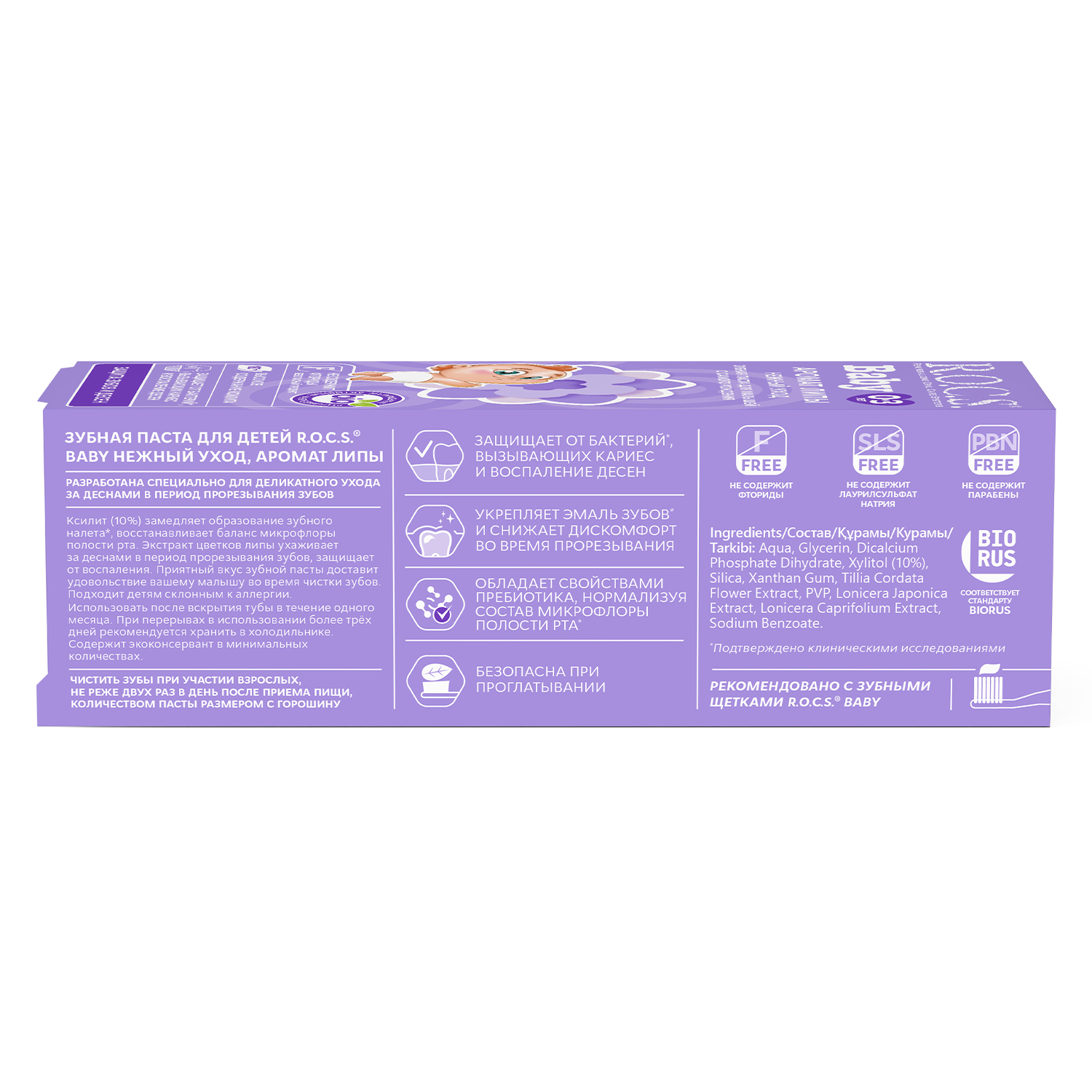 Зубная паста R.O.C.S. Baby «Аромат липы» предназначена для ухода зазубами малышей, начиная ссамого раннего возраста. Формула практически полностью построена набиокомпонентах растительного происхождения, активность которых сохраняется благодаря низкотемпературной технологии приготовления продукта, что делает ихмаксимально эффективными, атакже безопасными при проглатывании.