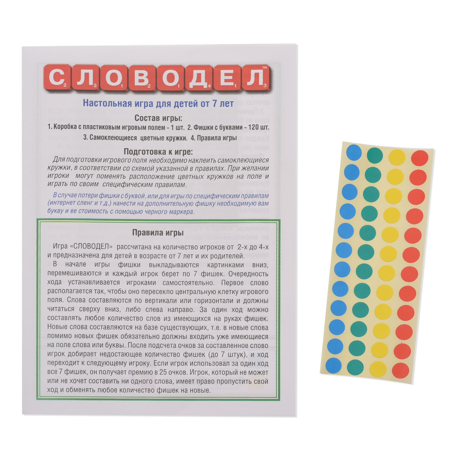 В наборе: игровое поле, 120 фишек с буквами, 10 дополнительных фишек и подробные правила игры.
