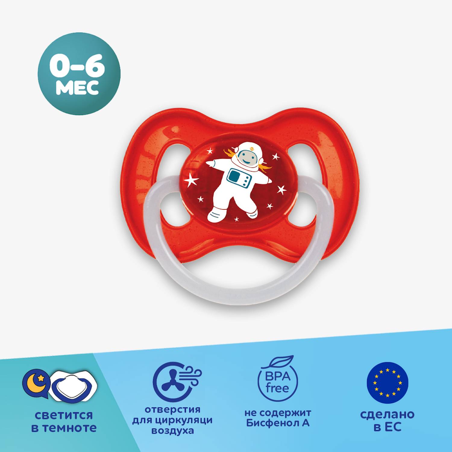 Пустышка круглая латексная Space 0-6 месяцев. Пустышка круглая латексная "Space" изготовлена из высококачественного натурального латекса - она очень мягкая и приятная для ребенка, при этом не слипается во время использования. Соска пустышки имеет классическую круглую форму. Благодаря специальным отверстиям на нагубнике она отлично вентилируется, что предотвращает риск возникновения покраснений и раздражения на нежной коже малыша. Кольцо пустышки светится в темноте, благодаря чему пустышку легко найти ночью, не боясь разбудить малыша.