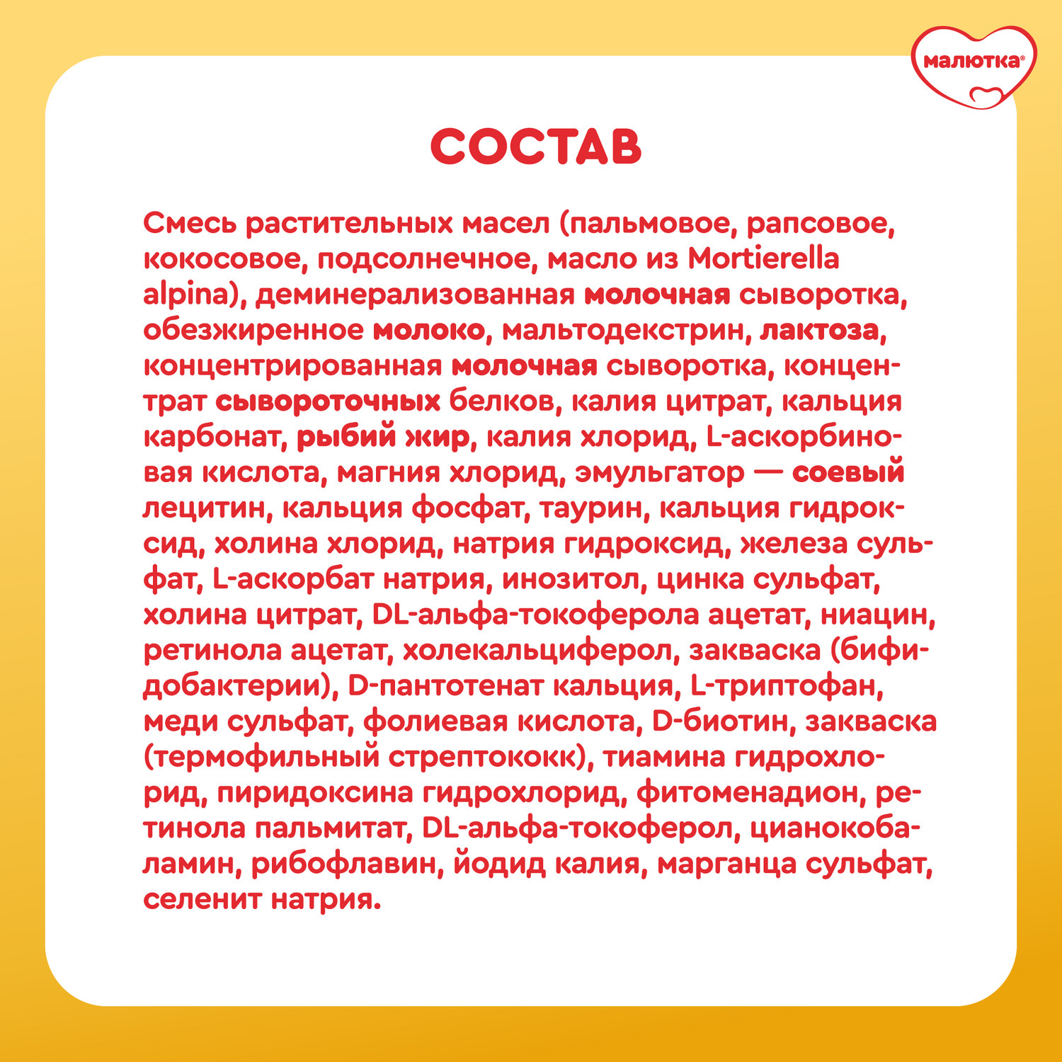 смесь растительных масел (пальмовое, рапсовое, кокосовое, высокоолеиновое подсолнечное, подсолнечное), деминерализованная молочная сыворотка, мальтодекстрин, обезжиренное молоко, лактоза, концентрированная молочная сыворотка, галакто-олигосахариды, концентрат сывороточных белков, эмульгатор – лецитины (из сои), калия цитрат, калия хлорид, кальция фосфат, натрия цитрат, рыбий жир, кальция цитрат, L-аскорбиновая кислота, кальция карбонат, холина хлорид, магния хлорид, масло из Mortierella alpina, таурин, железа сульфат, натрия L-аскорбат, инозитол, концентрат бифидобактерий, цинка сульфат, холина цитрат, концентрат термофильных стрептококков, антиокислитель – аскорбилпальмитат, никотинамид, DL-альфа-токоферола ацетат, ретинола ацетат, D-пантотенат кальция, L-триптофан, меди сульфат, L-карнитин, D-биотин, тиамина гидрохлорид, пиридоксина гидрохлорид, DL-альфа-токоферол, ретинола пальмитат, рибофлавин, фолиевая кислота, марганца сульфат, калия йодид, фитоменадион, холекальциферол, натрия селенит, цианкобаламин, регулятор кислотности – натрия гидроксид, лимонная кислота.