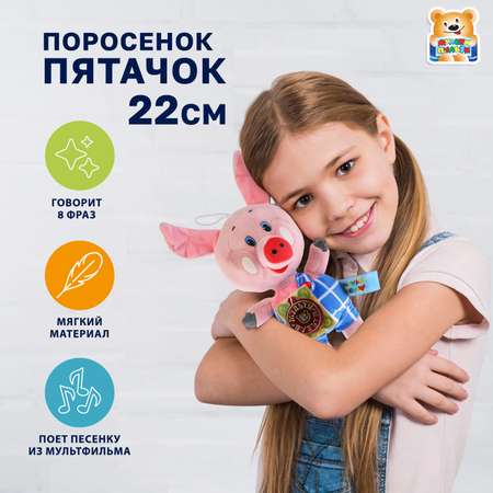 Любимый герой известного советского мультика — мягкая интерактивная игрушка “Пятачок”. Яркий розовенький поросёнок одет в голубые клетчатые шортики. Сделана из безопасного материала, искусственный мех. Пятачок озвучен — если на него нажать, ребёнок услышит 8 фраз из мультфильма и одну песенку.
