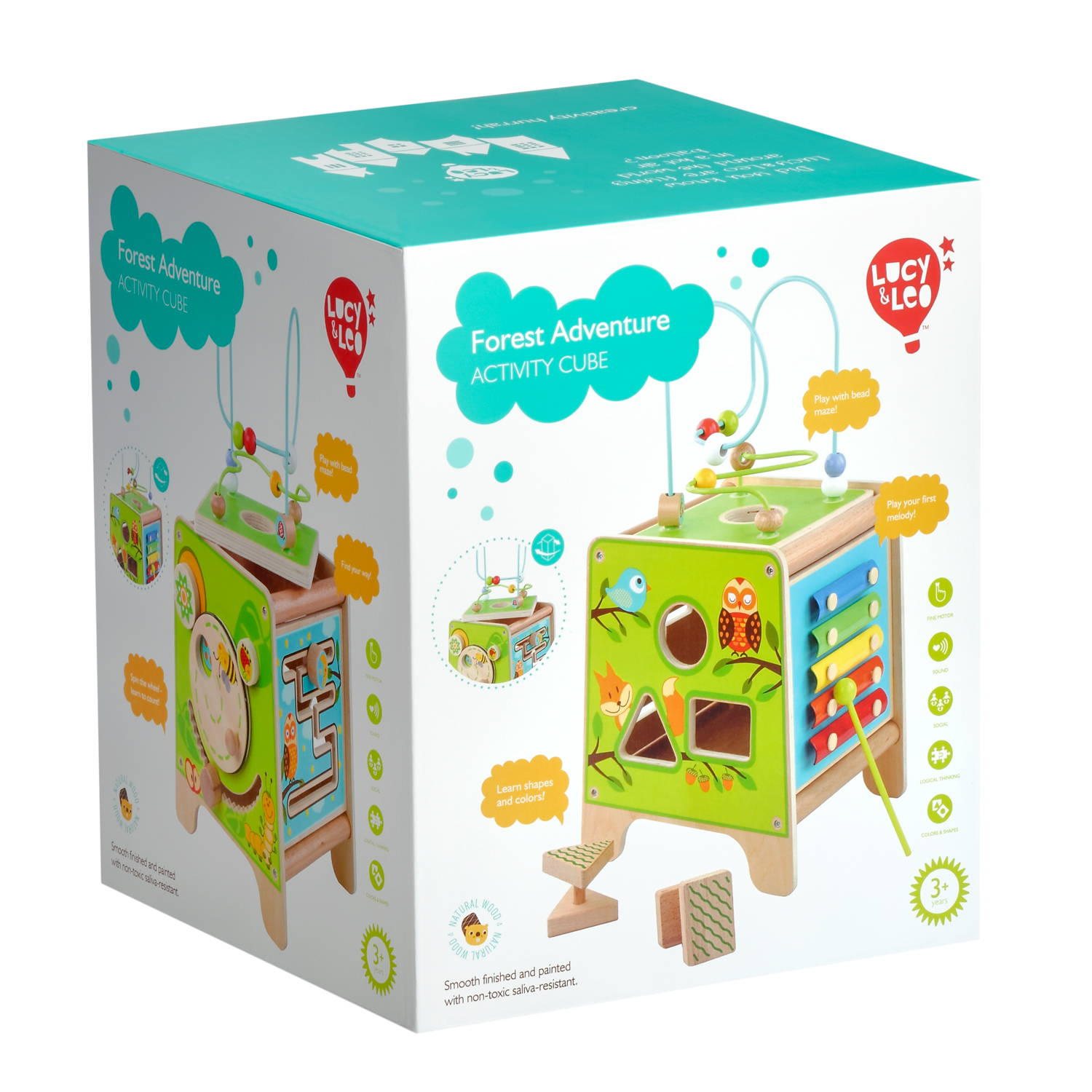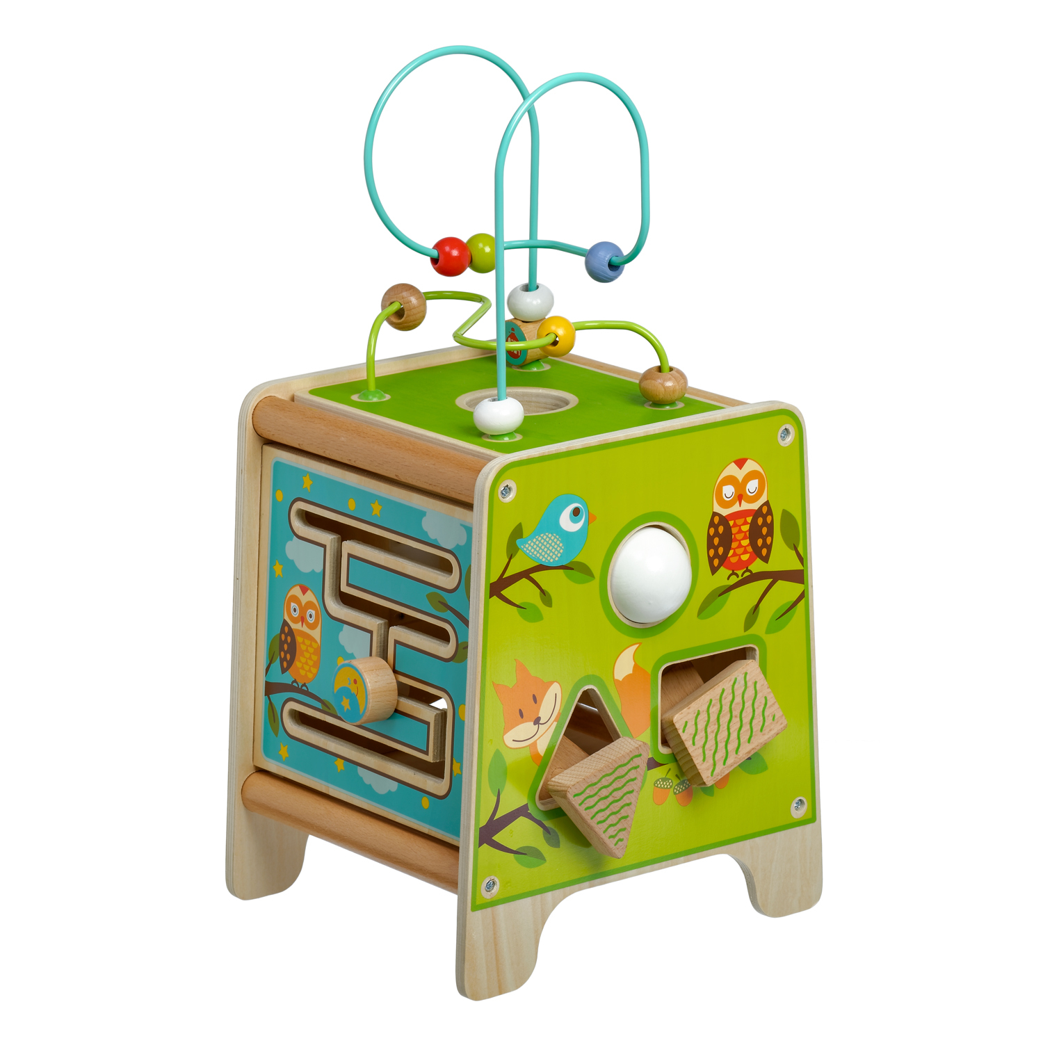 Универсальный куб и правда может заменить собой сразу несколько игрушек. Сверху у него — лабиринт из двух изогнутых проволок, а на остальных гранях вы найдете ксилофон, сортер, лабиринт другого плана (нужно передвигать кружок по прорезям) и мини-бизиборд на тему живой природы.