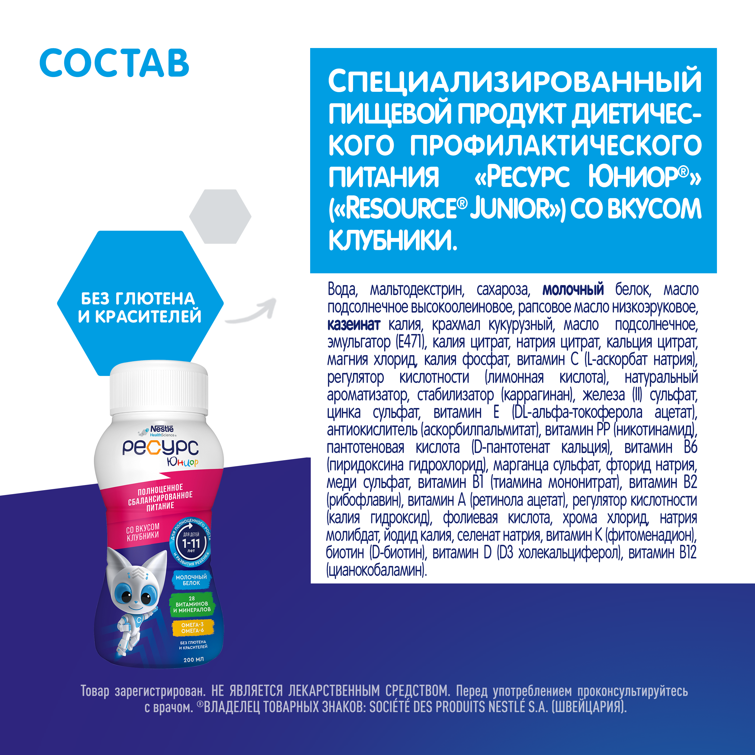 Ресурс Юниор (ранее Ресурс Клинутрен Юниор или Resource Clinutren Junior) в готовой форме – полноценное сбалансированное питание для детей от 1 до 11 лет в удобном формате, бутылочке 200 мл. Полноценное сбалансированное питание способствует поддержанию роста и развития ребёнка в период высоких нагрузок, активного роста, болезни и восстановления. Одна порция продукта Ресурс Юниор в формате бутылочки может заменить полноценный прием пищи на ~300 ккал. Содержит натуральный молочный белок (казеин и белок молочной сыворотки), необходимые витамины и минералы, Омега 3 и Омега 6. Может использоваться в качестве дополнительного или единственного источника питания.