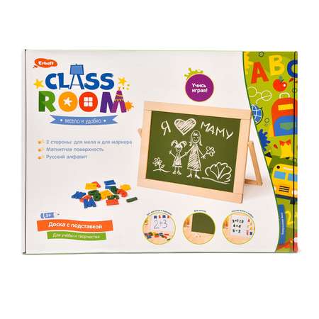 На металлической стороне магнитно-маркерной доски дети могут крепить элементы, входящие в ее состав (цифры, русские и английские буквы), а также рисовать маркером на водной основе. Все надписи впоследствии легко стираются сухим методом. Другая сторона доски служит для рисования на ней мелками, также входящими в состав набора.