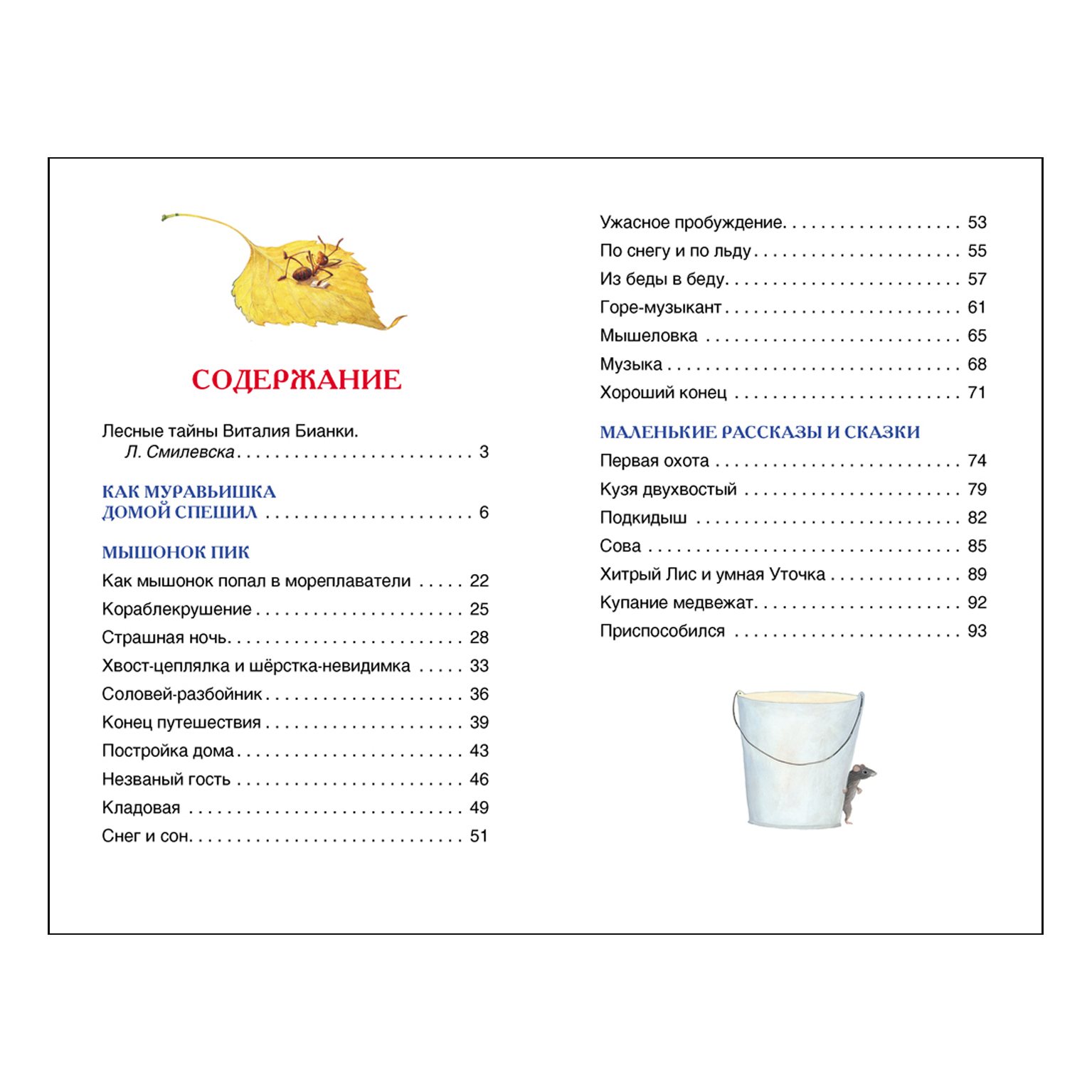 В книгу вошли следующие рассказы В. Бианки «Мышонок Пик», «Как Муравьишка домой спешил», «Первая охота», «Кузя двухвостый», «Подкидыш», «Сова», «Хитрый Лис и умная Уточка», «Купание медвежат», «Приспособился».