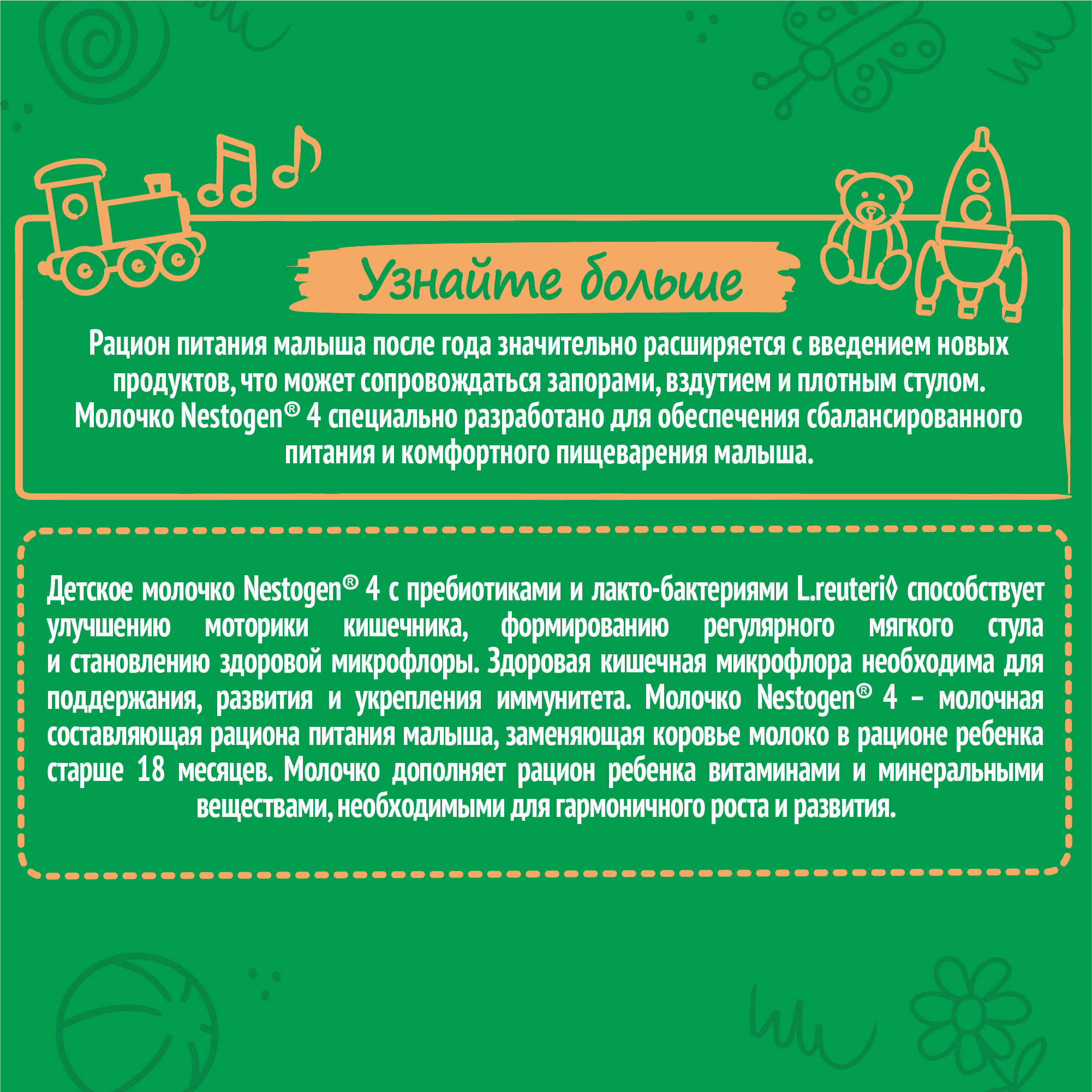 Рацион питания малыша после года значительно расширяется с введением новых продуктов, что может сопровождаться вздутием животика, запорами или плотным стулом. Состав молочка Nestogen 4 было разработан для обеспечения комфортного пищеварения, чтобы малыша не беспокоил животик и он мог счастливо играть и учиться новому.
