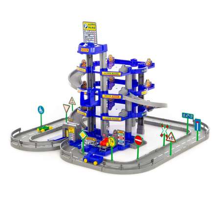 У паркинга есть лифт, набор дорожных знаков и машинки.