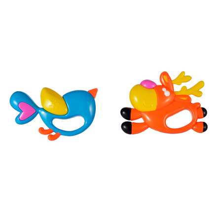- В комплект входят 2 красочные погремушки, выполненные в форме птички и оленя.