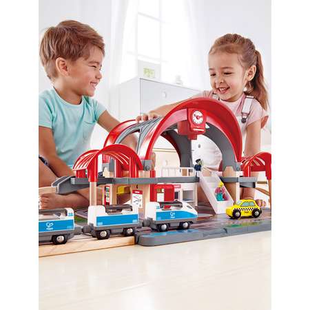 Оживленная станция полна веселья. Станция имеет два уровня, связанных лифтами для людей и экипажей. Свет на крыше верхнего уровня можно включать и выключать. В комплект входят трехвагонный скоростной поезд, такси и автобус. Двигатель и вагоны открыты для размещения игровых фигур и багажа. Другие интерактивные функции набора включают в себя регистратор для объявлений, чтобы пассажиры на станции не пропустили свои поезда или такси! Ребенок может играть роль кондуктора со знаком безопасности, механика с гаечным ключом и туриста с багажом. Трассы могут быть расположены по-разному и совместимы с другими железнодорожными наборами Hape. Возможности данного набора безграничны!