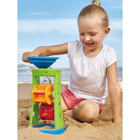Налейте воду, засыпьте песок или мелкие камни в воронку и посмотрите как вращаются колеса!