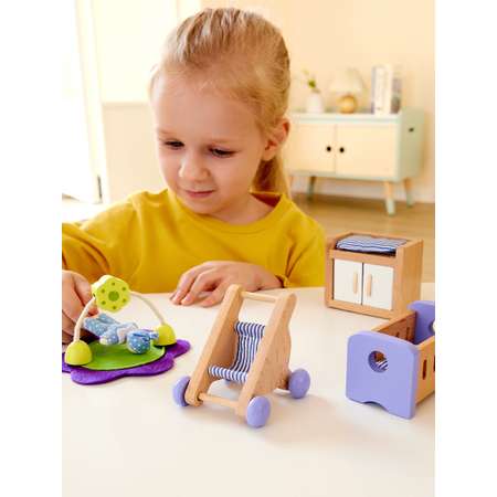 Включает: кроватку с постельными принадлежностями, пеленальный стол, коляску, игровой коврик.