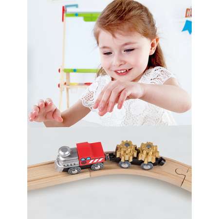 Подходит для самостоятельной игры или совместима с железными дорогами Hape и другими ведущими брендами.