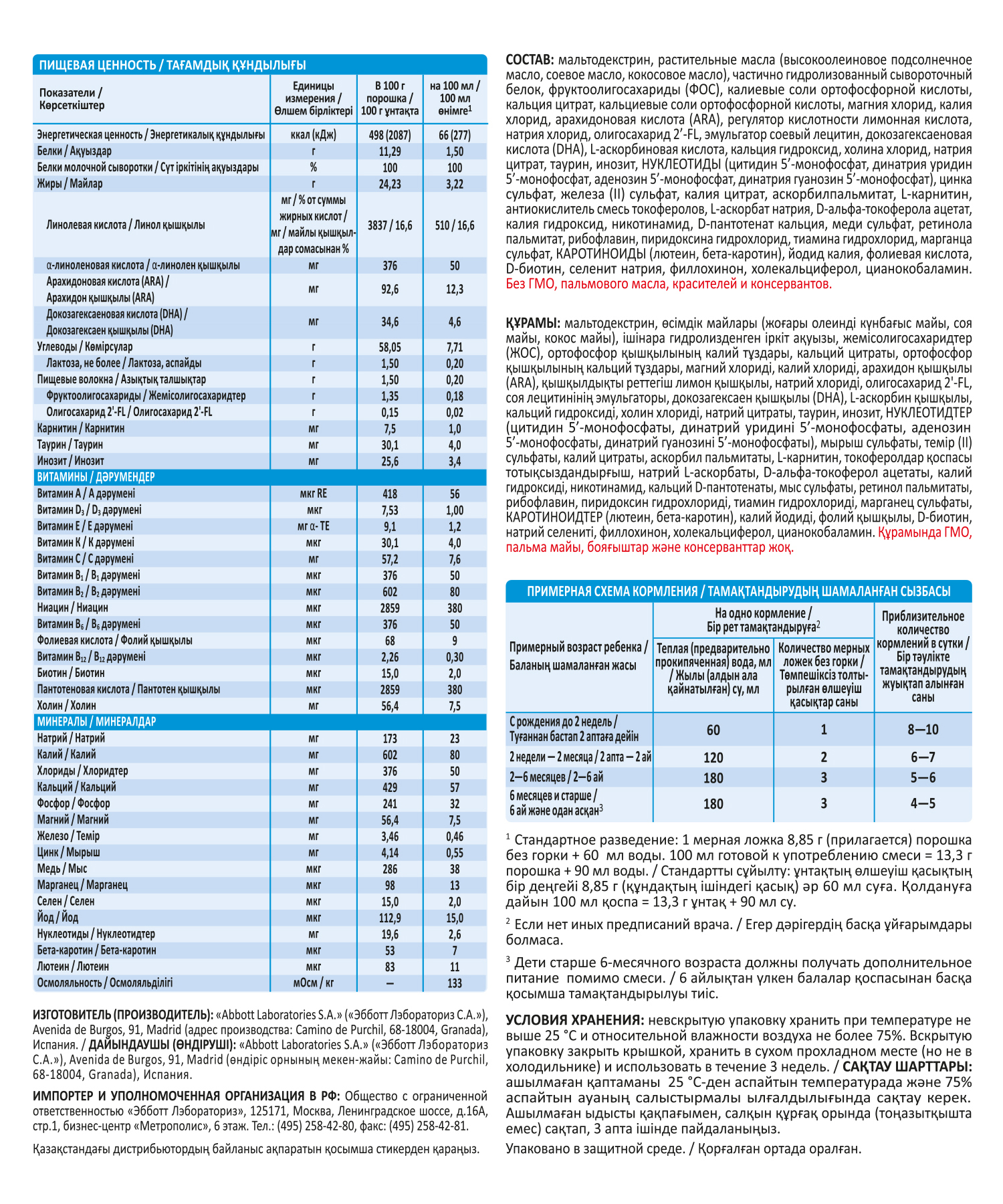| Состав: | мальтодекстрин, растительные масла (высокоолеиновое подсолнечное масло, соевое масло, кокосовое масло), частично гидролизованный сывороточный белок, фруктоолигосахариды (ФОС), калиевые соли ортофосфорной кислоты, кальция цитрат, кальциевые соли ортофосфорной кислоты, магния хлорид, калия хлорид, арахидоновая кислота (ARA), регулятор кислотности лимонная кислота, натрия хлорид, олигосахарид 2'-FL, эмульгатор соевый лецитин, докозагексаеновая кислота (DНА), L-аскорбиновая кислота, кальция гидроксид, холина хлорид, натрия цитрат, таурин, инозит, НУКЛЕОТИДЫ (цитидин 5'-монофосфат, динатрия уридин 5'-монофосфат, аденозин 5'-монофосфат, динатрия гуанозин 5'-монофосфат), цинка сульфат, железа (II) сульфат, калия цитрат, аскорбилпальмитат, L-карнитин, антиокислитель смесь токоферолов, L-аскорбат натрия, D-альфа-токоферола ацетат, калия гидроксид, никотинамид, D-пантотенат кальция, меди сульфат, ретинола пальмитат, рибофлавин, пиридоксина гидрохлорид, тиамина гидрохлорид, марганца сульфат, КАРОТИНОИДЫ (лютеин, бета-каротин), йодид калия, фолиевая кислота, D-биотин, селенит натрия, филлохинон, холекальциферол, цианокобаламин. Без ГМО, пальмового масла, красителей и консервантов. |