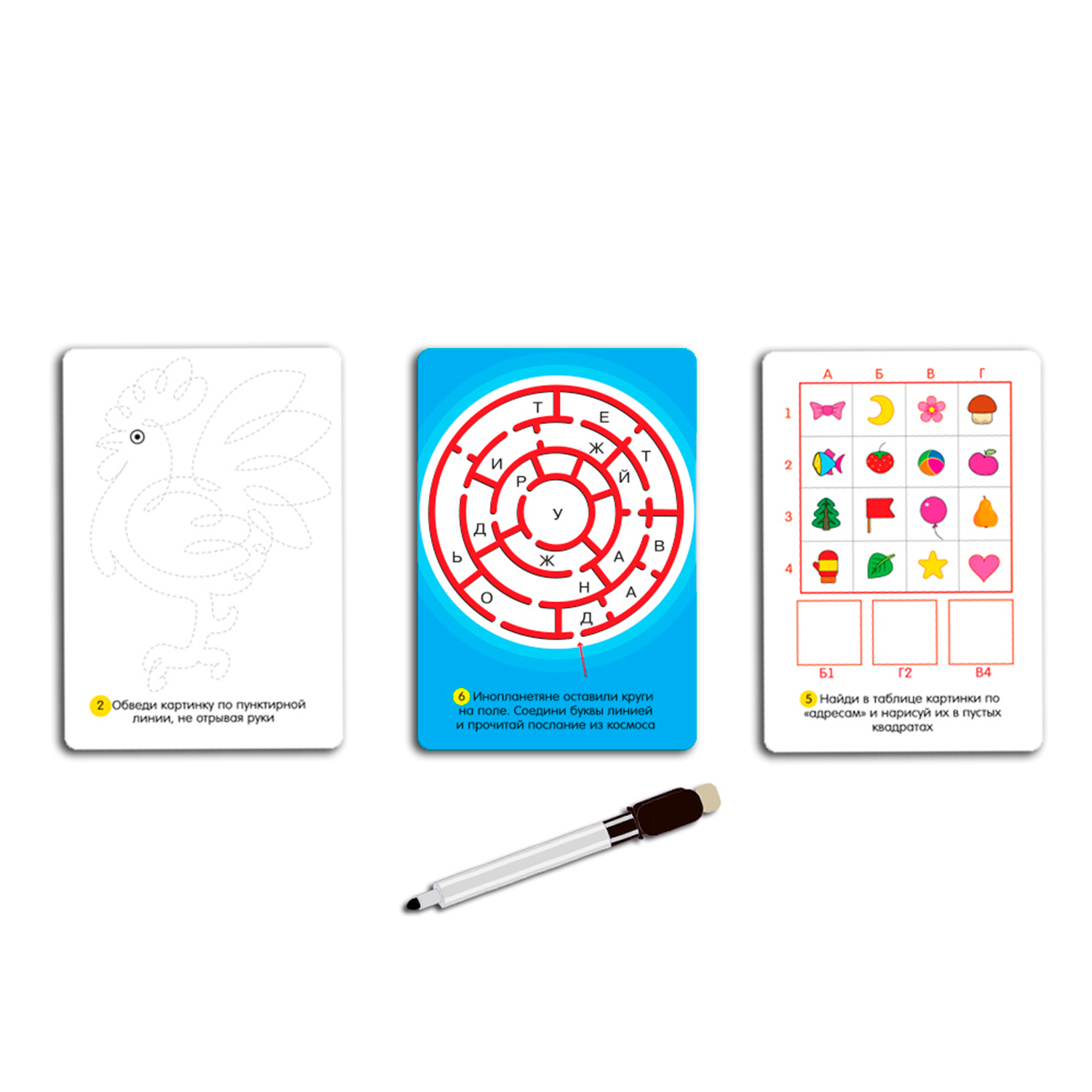 - Отличные карточки с головоломками. Дочка играет с большим удовольствием. Очень хорошо стираются карточки от маркера.