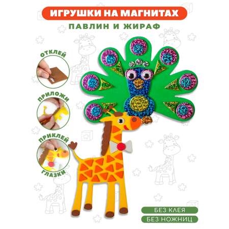- Нам зашло)красивые получаются магниты,в 2,7 еще тяжеловато конечно клеить мелкие детали,но вместе с бабушкой и мамой получилось приятное провождение времени)бабушка забрала жирафа себе,а нам остался трех глазый павлин))(для жирафа нужен 1 глаз,но положили два) За такую цену отлично,можно оставить надолго на память на холодильнике.
