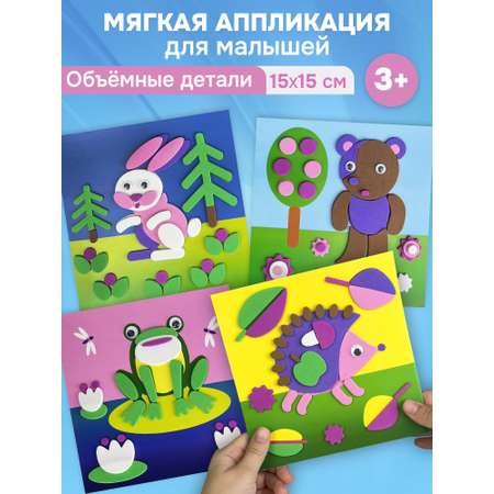 Простые картинки и небольшое количество крупных деталей делают эту аппликацию понятной и доступной для малышей от 3 лет. Детали набора насыщенные и мягкие на ощупь, легко приклеиваются на картинку-основу. Несмотря на простоту исполнения, готовое изделие отличается красочностью, рельефностью и выразительностью. В наборе 4 аппликации.