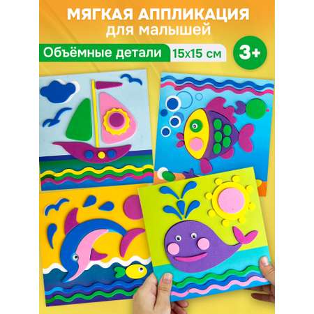 Простые картинки и небольшое количество крупных деталей делают эту аппликацию понятной и доступной для малышей от 3 лет. Детали набора насыщенные и мягкие на ощупь, легко приклеиваются на картинку-основу. Несмотря на простоту исполнения, готовое изделие отличается красочностью, рельефностью и выразительностью. В наборе 4 аппликации.
