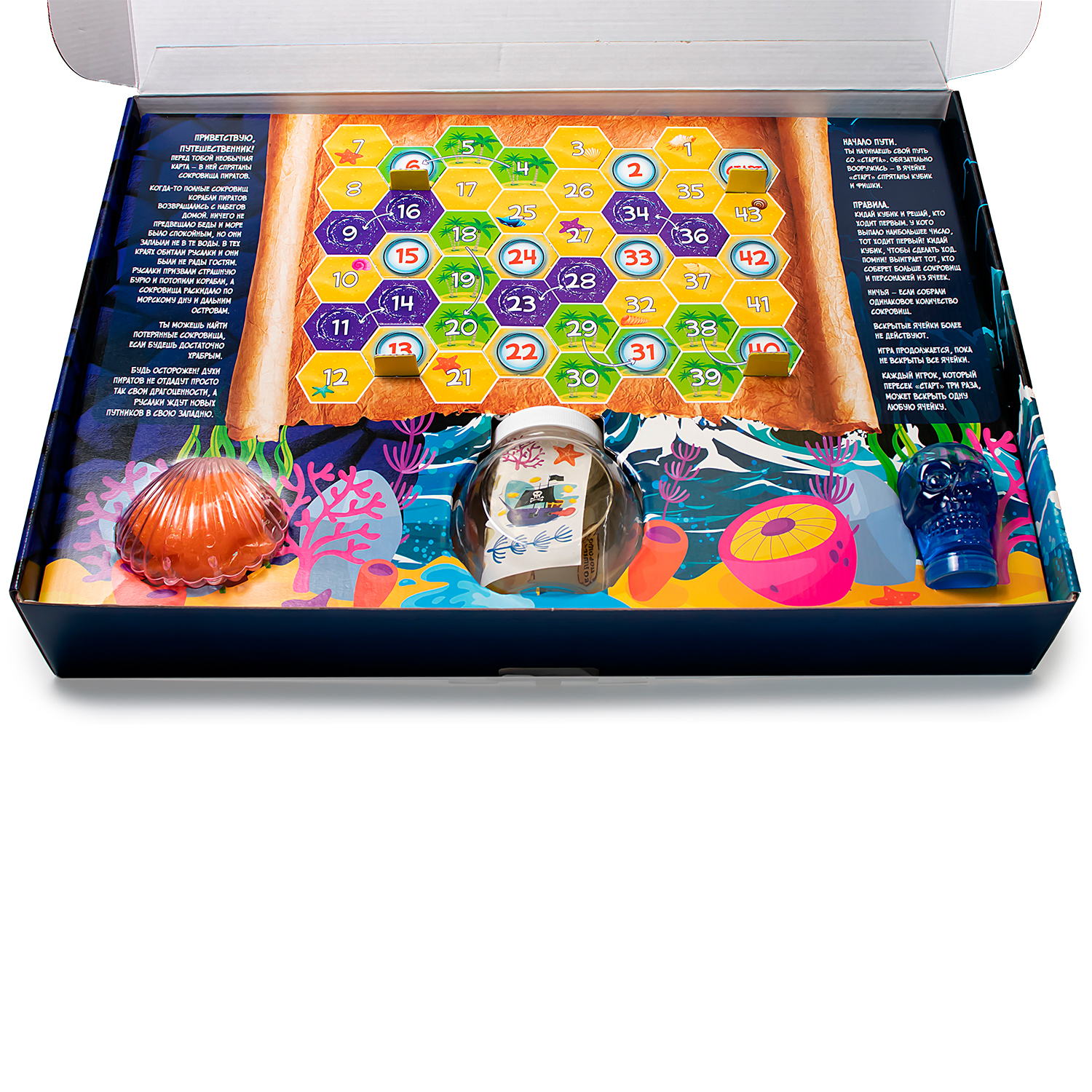 Это уникальный интерактивный набор, который погрузит ребенка в необыкновенное приключение в поисках пиратских сокровищ. Игровое поле сделано в виде настоящей пиратской карты, внутри которой спрятаны сокровища и загадки.