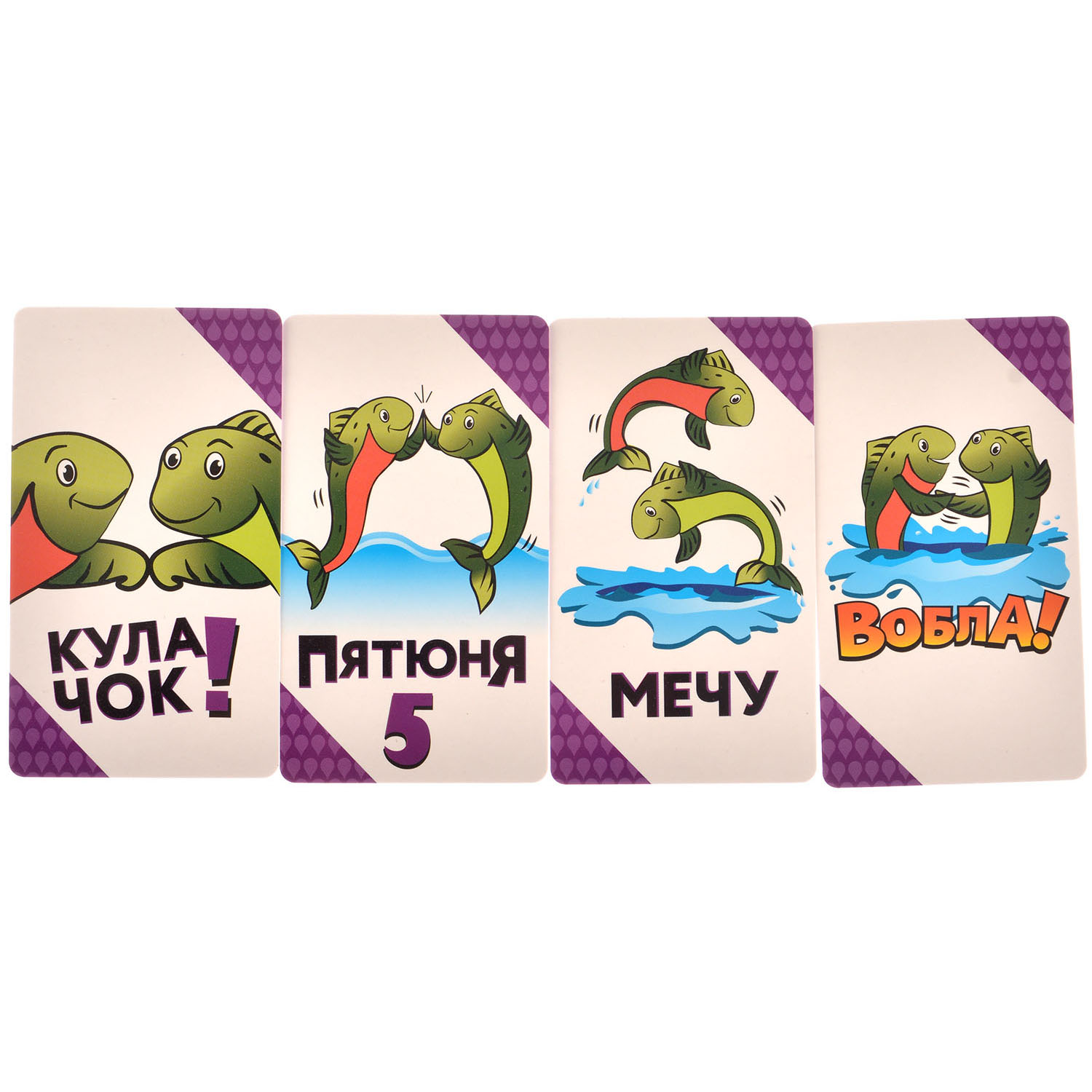 "Вобла" – это на удивление простая игра на реакцию. Всё, что нужно делать – это громко кричать и раздавать друзьям пятюни, биться кулачками и трясти запястьями (в игре это называется Вобла!). Каждый получает по двенадцать карт с рубашкой одного цвета и цель игры – первым сбросить все карты и крикнуть "Рыба".