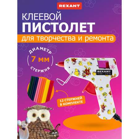 Клеевой пистолет в наборе с цветными клеевыми стержнями REXANT предназначен для прочной фиксации поверхностей с помощью расплавленной клеевой массы. На корпусе изображены забавные пчелки, которые так нравятся детям! Инструмент используется для занятий рукоделием вместе с детьми: позволяет мгновенно склеить всевозможные поверхности и материалы: дерево, пластик, резину, кожу, стекло, металл, ткань, пенопласт, керамику, картон, бумагу, цветы или что-то другое. Клеевой пистолет заправляется специальным стержнем диаметром 7 мм. Корпус инструмента изготовлен из ударопрочной пластмассы и имеет скобу для надежной установки в нерабочем положении. Принцип работы: термоклей плавится в металлической камере с помощью нагревательного устройства и для точного дозирования при нажатии на курок подается из сопла на склеиваемую поверхность. Легкий и компактный пистолет идеально помещается в детскую руку, не доставляет дискомфорта во время процесса.
