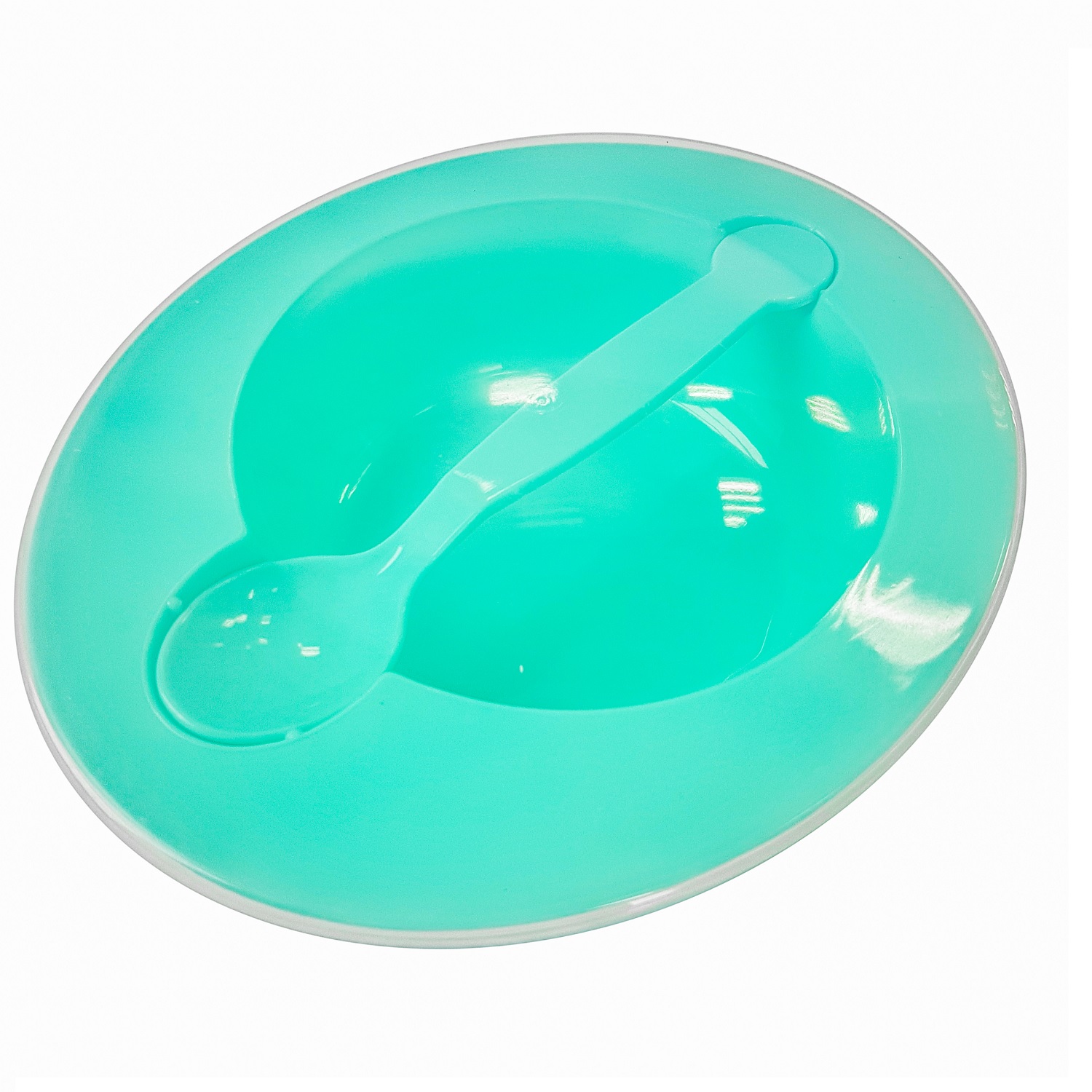 - Хорошая тарелка, небольшая и не маленькая, по объёму то, что нужно! Удобная ложечка! Можно греть в микроволновке!