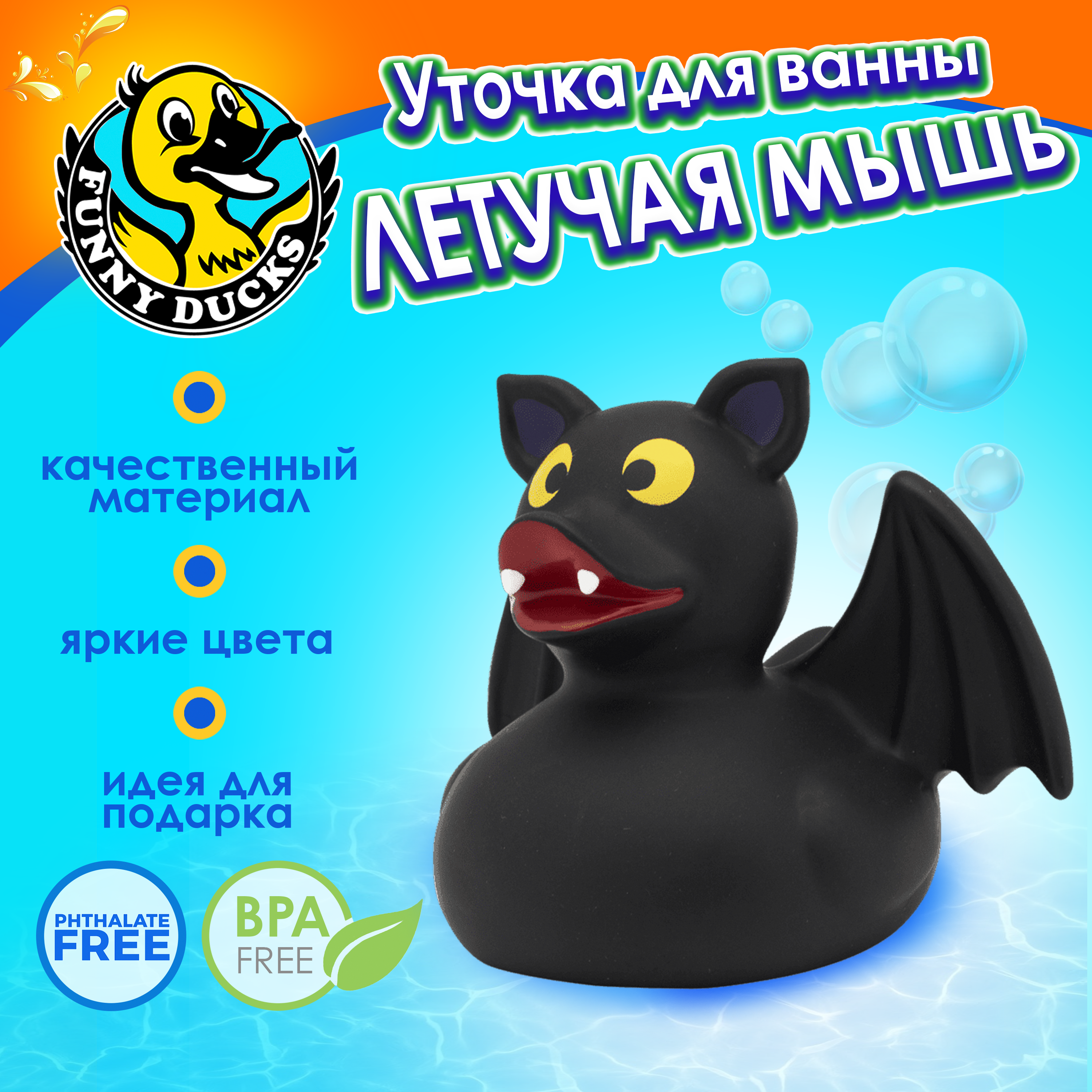 Летучая мышь — уточка FUNNY DUCKS из коллекции «Животные». Забавная фигурка поможет ребенку лучше узнать мир фауны. С ней можно учиться в игровой форме — педагогами доказано, что так знания усваиваются намного лучше. Уточка Летучая мышь — нешаблонный сувенир и элемент декора на Хеллоуин. Ею можно украсить интерьер, тематически сервированный стол, подарить гостям вечеринки на память. Если нужно, мы нанесем на уточек символику бренда или организации, чтобы она стала оригинальным корпоративным сувениром для креативной компании. Фигура окрашена в глубокий оттенок, который долго не выцветает и не истирается. FUNNY DUCKS не портятся от воды, с ними можно хоть каждый день играть в ванне или бассейне (придерживаясь правил по уходу). Другие особенности игрушки: малый вес — Летучая мышь весит 50 г, с ней может играть даже маленький ребенок; гладкая поверхность без съемных частей — нет ничего, чем малыш до трех лет мог бы подавиться; отсутствие неприятных запахов и токсичных компонентов.
