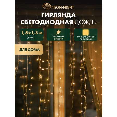 Светодиодная гирлянда NEON-NIGHT Дождь-занавес 1.5х1.5 м 8 режимов тепло-белое свечение 235-036