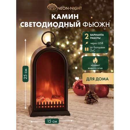 Светодиодный светильник-камин NEON-NIGHT Фьюжн с имитацией горящих дров и эффектом живого огня - незаменимый помощник в создании неповторимой атмосферы уюта и тепла. В отличие от настоящего огня, светодиодный камин не выделяет копоти и дыма, не выбрасывает искр и не несет опасности возгорания. Светодиодные источники света имеют бесспорное преимущество перед ламповыми, поскольку ресурс светодиодов составляет 100 000 часов. Настоящая сказка внутри светильника появляется после подключения элементов питания.