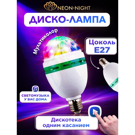 Светодиодная Диско-лампа NEON-NIGHT подойдет для организации настоящей вечеринки прямо у Вас дома! Изделие представляет собой уникальное устройство для создания эффекта цветомузыки с помощью динамического вращения потока разноцветных лучей. Пластиковый белый корпус с прозрачным преломляющим куполом скрывает внутри компактный мотор. Лампа вкручивается в универсальный цоколь Е27 в торшере или люстре, как стандартная лампочка для освещения пространства. Используемые светодиоды имеют бесспорное преимущество перед ламповыми, поскольку ресурс светодиодов составляет 100 000 часов. Не ограничивайте себя в выборе места Вашей дискотеки: лампа помещается в любую сумку или рюкзак. Вы также можете использовать цоколь с выключателем, который приобретается отдельно, и подключить диско-лампу к сети 220 В.