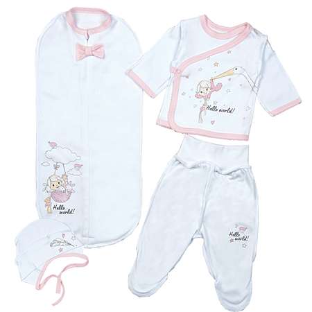Состав комплекта: конверт, кофта-распашонка, ползунки, чепчик.