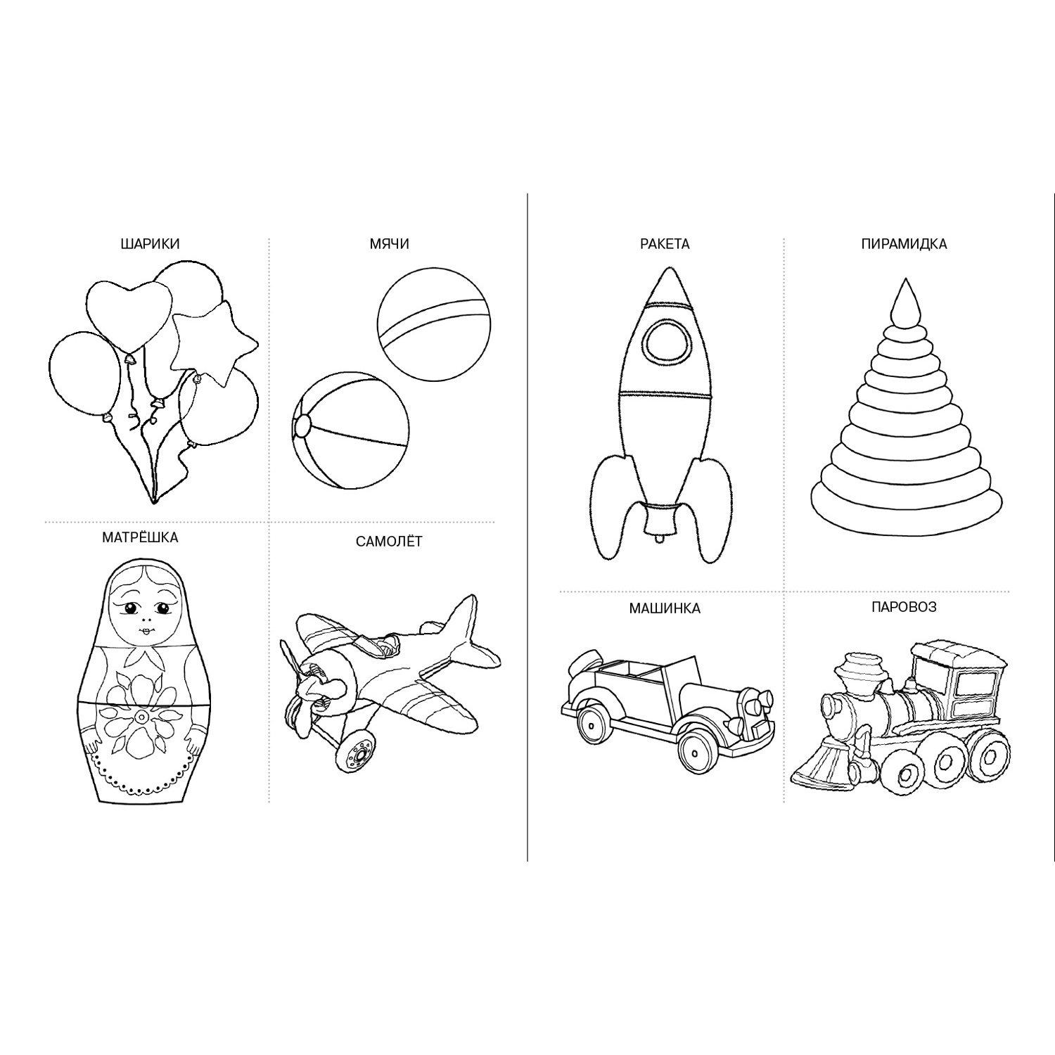 Книга содержит тематические контурные рисунки с изображением игрушек, фруктов, овощей, ягод, грибов, птиц, домашних и диких животных, видов транспорта. На оборотах обложки даны раскрашенные образцы-подсказки. Раскраска мелких и крупных деталей — прекрасная тренировка мелкой моторики руки, подготовка ее к выполнению графических работ при школьном обучении.