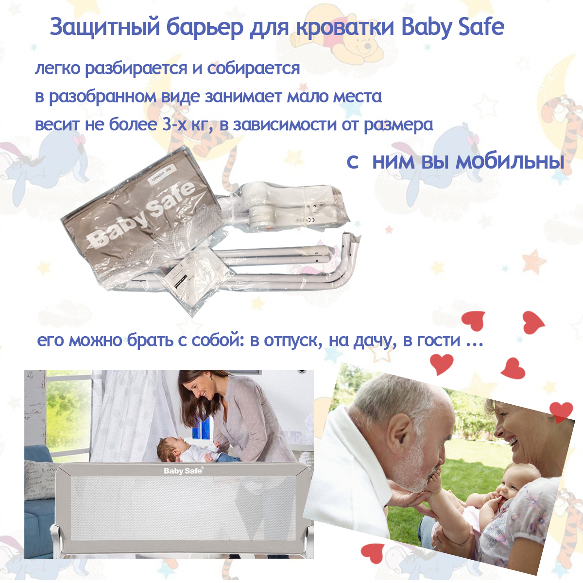 Защитный складной барьер BABY SAFE на металлическом каркасе для детской кроватки с прорезью из сетки. Длина 180 см, высота 66 см. Тканевый Барьер BABY SAFE на сборном металлическом каркасе, предназначен для предотвращения падения малыша с кровати во время сна, как совместного, так и самостоятельного. Барьер BABY SAFE подходит для большинства моделей кровати, с высотой бортика кровати от днища, на котором лежит матрас до 15 см. При более высоком бортике кровати, барьер будет выполнять свою функцию, но его нельзя будет сложить. Так же, учитывайте высоту кровати, для того чтобы бортик полностью опускался. Барьер устанавливается ножками под матрас или крепится шурупами, через специальные отверстия в ножках. ОСОБЕННОСТИ БАРЬЕРА: - функция складывания. При необходимости его легко опустить нажатием на две красные кнопки. В моделях длиной от 150 см, кнопки необходимо нажимать поочередно. Во время сна его легко поднять до характерного щелчка. - сетчатое окно. Окно из сетчатой ткани позволяет ребенку свободно дышать во время сна, если малыш уткнулся носом в него. Во время бодрствования, через сетчатое окно малыш видит родителей, а родители малыша. - мобильность и простота в установке. Барьер можно брать с собой в путешествия, поездки за город или просто в гости. Он легко разбирается и собирается. Занимает мало места в разобранном положении и весит не более 3-х кг, в зависимости от размера барьера. -ткань барьера легко стирать. Иногда достаточно протереть влажной губкой с мыльным раствором. Рекомендации по подбору и меры предосторожности: - не стремитесь выбрать высокий барьер. Для безопасного сна достаточно если барьер выступает над матрасом на 20 – 25 см. Высокий барьер провоцирует ребенка вставать и раскачивать барьер. Это небезопасно для ребенка и так же может привести к поломке складного механизма. - для детей постарше мы рекомендуем выбирать длину барьера на 40-50 см короче кровати. Это позволит ребенку самостоятельно и безопасно слезть с кровати. - при сборке барьера пользуйтесь инструкцией. Особенно внимательно устанавливайте последнюю трубку после того, как наденете тканевый чехол. Рекомендуем перед этим опустить барьер. Убедитесь, что ставите трубку правильной стороной. Материал: металл + ABC пластик + текстиль. Соответствует европейскому стандарту BS7972:2001+A1:2009 EN71. Барьер поставляется в разобранном виде и прост в установке. Всё необходимое есть в комплекте.